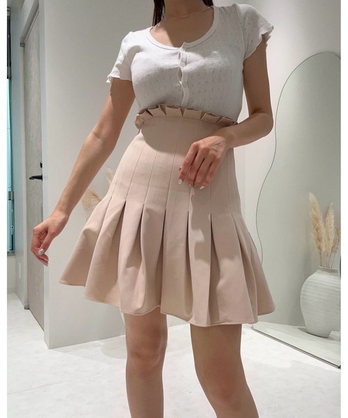 ウエスト部分にフリルが施されたミニ丈のスカート。ハイウエストな作りで、タックの入ったデザインが女の子らしさを引き出してくれます。中の生地はパンツになっているのでミニ丈でも安心です。