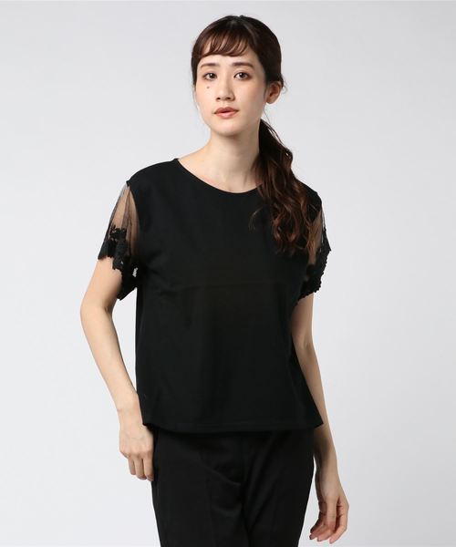 透明感溢れる袖のフラワーモチーフレースが可愛い花柄レースミックスTシャツ☆ カジュアルになりがちなTシャツにレース素材をミックスして品よく仕上げました。 リラックスして着られるカットソー素材でデイリー使いにぴったりな1枚です。 甘い印象になりすぎないので普段カジュアルな服を選びがちな方にもおすすめです。 清涼感溢れる見た目と素材感で暑い夏を涼しげに乗り切れるアイテムとなっております。 コンパクトで何にでも合わせやすいサイズ感に仕上げておりますのでロングスカートやデニムなどは勿論、キャミワンピ等のインナーにもおすすめ♪