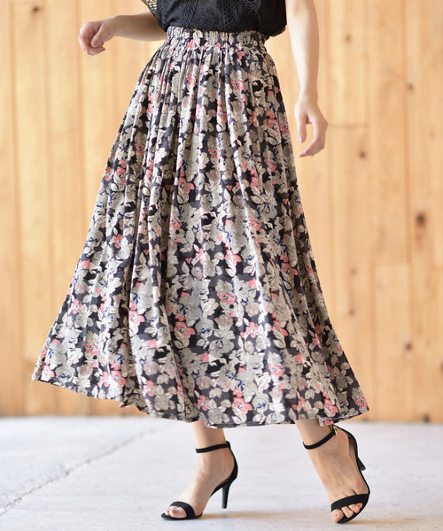 お好みの柄がきっと見つかるアンティークフラワースカート豊富な花柄が魅力のロングスカート。アンティークなタッチとシックな色使いのヴィンテージライクな1枚です。ウエストのたっぷりのギャザーがふんわりとした女性らしいシルエットを形成。今年らしいロング丈はリゾートスタイルにもピッタリです。幅広のゴムを入れたウエストはトップスをインしてもきれいに決まります♪裏地あり伸縮性なし薄手ウエスト総ゴムプリントムラ等みられる場合もございます生地の取り方でデザインに個体差が生じます洗濯:手洗い可