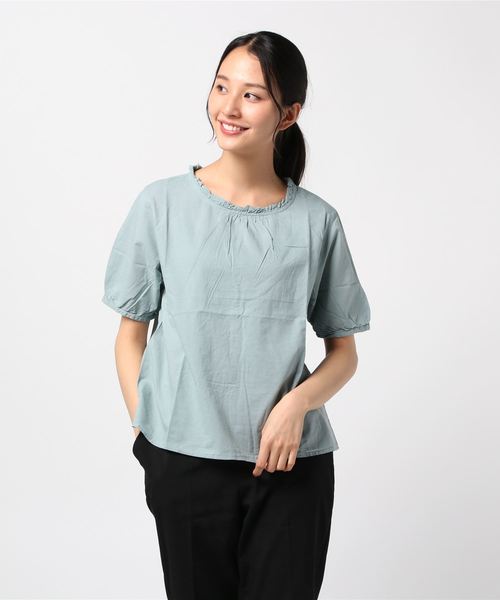 襟ぐりにさりげなくフリルを施し、清楚な雰囲気に仕上げたブラウス。 深めのスリットにリボンを添えたバックスタイルが可愛らしく、抜け感のある着こなしが叶います。 コットン100%の天然素材を使用しており、肌触りがよく、夏場も快適な着心地です。