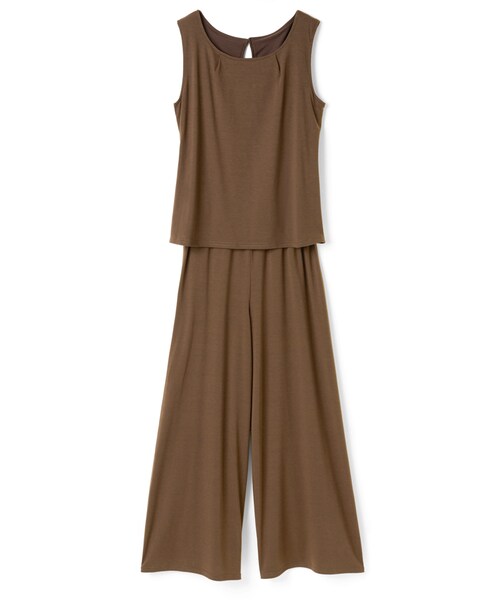 リラクシーな着心地なのに可愛らしい、カジュアルモードに欠かせないオールインワン。 セットアップ見えするのに、さっと着られるのがうれしいトコロ。 シンプルデザインとカラーリングだから、大人の女性にもぴったり。 ネックにタックを入れて動きを生み出しているのがポイント。 ワイドパンツが気になる脚のラインをカバーし、美脚効果もバツグン。 ★ウエストゴム入りです。