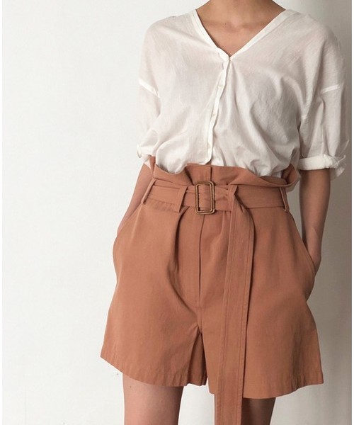 長く垂れ下がったベルトが特徴的なハーフパンツ。ウエストが大きいのでベルトできゅっと締め、ギャザーを寄せて着るのがポイント。しっかりとした張り感のある生地がカジュアルな印象で◎ トップスはインして着るのがおすすめです。