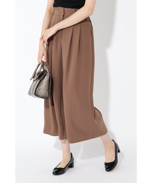 ウエストに深いタックを畳んだ立体的なシルエットが美しいワイドパンツ。腰位置を高く設定したハイウエストデザインに、足首が覗く短めのレングスでスタイルアップ効果が期待できます。脚が泳ぐゆったりとしたラインに、程良く落ち感のある上品素材で大人っぽく装えます。バックウエストがゴム仕様になったイージーな穿き心地も◎。