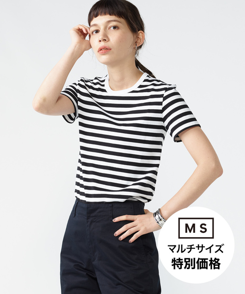 【デザイン】様々な年代と体型に合うボーダー幅を研究し、どんな場面でも使える中細ボーダーをご用意しました。どんなサイズの方でも裾と袖口には必ず濃色が出るように柄合わせをしているため、ステッチの色と生地の色が合わないということもありません。襟にはリブ編みのバインダーネックを採用し、着る時に頭を通しやすく、それでいてヨレにくい仕様にしています。【素材】良質な綿を使って編まれた40番双糸の繊細な生地に、さらに毛羽が少なくなるサイロコンパクト紡績を施した、きめ細かく滑らかな風合いのZOZOオリジナル生地を使用しています。この糸を使用した生地は洗濯を繰り返しても風合いを損なわず、生地もヨレにくい特徴を持っています。また糸の段階から色を染める先染めを施しているため、洗濯しても色落ちしにくく、購入時の風合いを長く楽しんでいただけます。