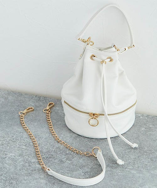 スタイリングにトレンド感を添える“2wayデザイン巾着バック” 【素材】 シーズンを問わない、フェイクレザー調のPU素材を使用。 【デザイン】 トレンド感のあるコロンとしたフォルムが可愛い巾着型バッグ。 ハトメ部分やジップをゴールドで統一することで、上品さと高見えを叶えます。 ハンドバッグとしてもショルダーバッグとしても使える、 取り外し可能なチェーンショルダー付きなので、雰囲気を変えてお楽しみいただけます。 見た目以上にマチがしっかりとあり、生地も柔らかく、使い勝手も抜群! 軽くて持ちやすく、シーズンレスでお使いいただけるのも嬉しいポイントです。