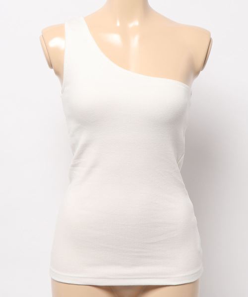 今季注目アイテム、ワンショルダーデザインのタンクトップが登場。ヘルシーな鎖骨見せで女性らしさを高めます。リブ入りで、伸縮性があり、ボディーラインにほどよくフィット。カップ付きなのも魅力的です。馴染みやすい色合いで、使い勝手の良く着回し力がある一枚です。