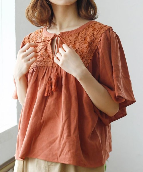 前後2WAYで着こなせるレースフレアブラウス。 ゆったりとしたフレアスリーブが女性らしい印象をプラス。 リネン混素材で肌触りがよく夏にもぴったりの1枚です。 オレンジ、ホワイトの2カラー。