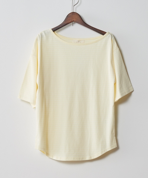ネックがアシメトリーになったTシャツ。インナーにタンクトップなどをチラ見せしたコーディネイトを楽しめます。薄手でさらっとした素材感で暑い真夏の重ね着も気持ち良く合わせられます。淡いカラーのボーダー柄でヘルシーな印象。デニムスタイルはもちろん、ボリュームスカートにインしてこなれナチュラルなコーデにも◎