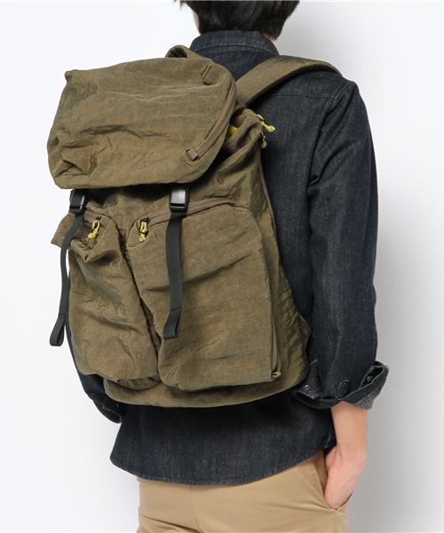 大胆なカラーリングと大きく付けたポケットが象徴的なカジュアルバッグシリーズです。特殊な加工を施したオリジナルナイロン素材は、撥水性もあり丈夫という機能面と、特徴的な風合いを持たせたデザイン性の両方を兼ね備えています。手や肩に触れる部分には厚めのクッション素材に加え、肌触りを考え触り心地のよい素材を使用しております。バックパックに付けられたポケットはファスナーを斜めに付けることで、中が見やすくまた取り出しやすい仕様になっています。本体の側面にもファスナーがあり、上からだけでなく横からも物を取り出せるようにもなっています。