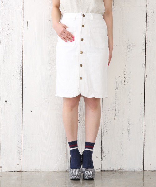 who’s who Chico(フーズフーチコ) 大人気のデニムタイトスカートが再入荷致しました! 伸縮性のあるタイプなので、通気性も良くとても履きやすくなっております。 フロントにデザインが入っている為、シンプルなトップスをインしたりショートトップスを合わせてもきれいに着て頂けます。