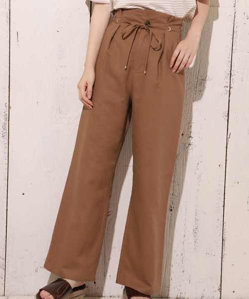 ~NICE CLAUP 2019 Summer Collection~ ■麻混ハイウエストパンツが夏でも着やすいライトな生地になって登場! 夏らしいさらりとしたリネン生地で涼しく履いていただけます◎ ウエストはハイウエスト&フリル風のディテールでカジュアルすぎず、 華奢なリボンがポイントにコーデにアクセントをプラス。 ハイウエスト&裾に向かって広がるワイドシルエットで脚長効果◎ さらには、ウエストの後ろにはゴムが入っているので楽ちんなのもうれしいポイント! ■スタイリング ビスチェやサファリシャツなどと合わせてトレンドライクなスタイルがオススメ! またワンショルトップスやブラウスでオンナ度アップ! ガーリー派でも着回ししやすいアイテムです。 カラバリはアースカラーのアイボリー、ベージュ、キャメル、ブラウンをご用意。 アースカラーを取り入れるだけで、こなれ感がでます。 ※サンプルでの撮影のため、実際のものと仕様や色が異なる場合があります。 ※室内、室外での撮影のため実際より明るく映っていたり、暗く映っていたりする場合がございます。