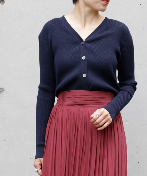 襟のⅤネックがシャープでスッキリ感が増すカーディガンです。リブが細くストレッチが効いているのでインナーにブラウスやニットも中に着て頂けます。Ⅴネックの為、ボタンをお開けて着て頂くとスッと下に落ち、もたずかずキレイなシルエットで着て頂けます。