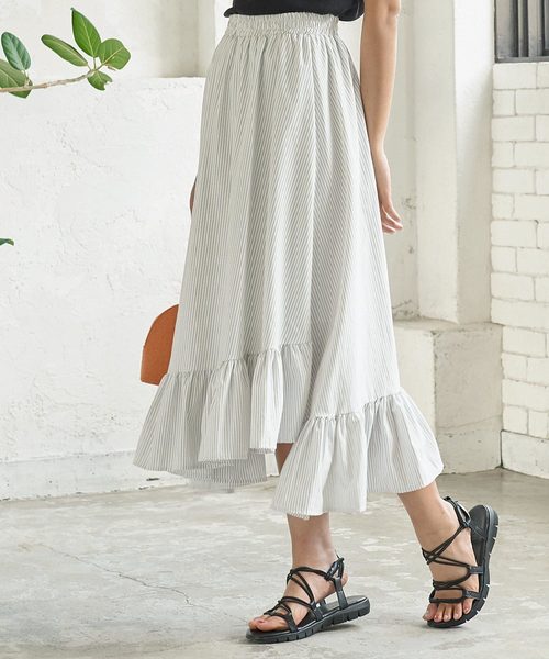 裾切替えがおしゃれなフレアスカート。切替でギャザーを寄せたフリルヘムの、ふわふわと揺れる華やかな雰囲気と女性らしさを楽しめます。今年らしいナチュラルな風合いが大人っぽくてGOOD。無地と春夏らしいストライプ柄をご用意。 【素材・サイズ感】ほのかにハリのある着心地のいい素材感。ウエストはゴム仕様の為、ストレスフリーな着用感。裏地付きなので足さばきもスムーズ。広がり過ぎないシルエットに長めに着丈なのでデイリーユースにもおすすめです。