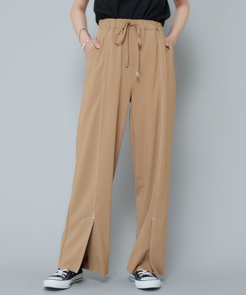 バイカラーのステッチでメリハリを効かせたパンツです。テロッとした着心地爽やかな素材感とウエストのドローストリングでストレスフリーに着まわせます。裾に施されているスリットで足さばきが良く、さりげなく個性が光ります。トレンドライクなゆるシルエットでカジュアルながらコーディネートをアップデートしてくれます。