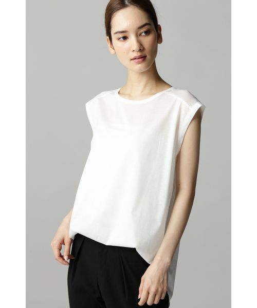 希少なハイゲージの編み機を用いた、ジャージーとは思えないほど高密度で繊細な天竺素材。部分的にオーガンジーを切り替え、今年らしいシアーな質感をプラスしたノースリTシャツ。特別な素材感が周囲に差をつける上級な1枚。前後差をつけたラウンドヘムデザインで、トップスアウトも断然おしゃれに決まります。