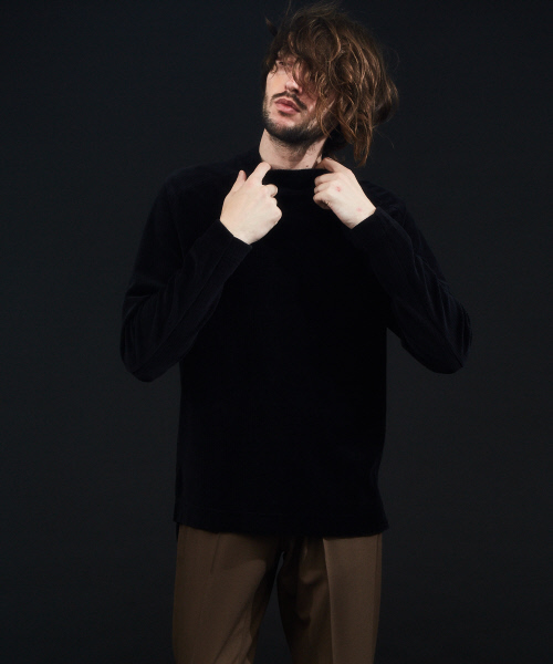 【MATERIAL】ベルベッドをイメージしたジャージ素材を使用。ブランドらしくリブ調に仕上げることでシャープさを演出しています。肌触りを重視したち特性上、毛足が寝やすいので、気になる場合、スチームアイロンで蒸気をあてると回復します。【DESIGN】肌触りの良さを生かしモックネックカラーでデザイン、肩から袖にかけては変形スプリットラグランにし、袖にはライダースのような二枚袖のひねりデザインが入っています。また、脇裾にはポケットに手が入れ易いようスリットが入っており、ベーシックな中にもデザインが効いたアイテムに仕上がっています。