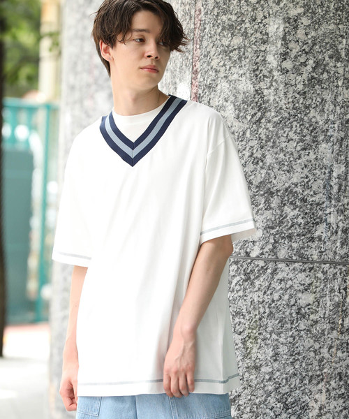 トレンド要素を抑えた1枚でキマルアイテムチルデンベストの衿の特徴は、残しつつ一枚でキマる半袖Tシャツに仕上げたアイテム。太めのラインリブを使用した重ね衿がデザインポイント。裾にリブを使用しているため、シャツや軽アウターを羽織った時にチルデンベスト着た印象に。