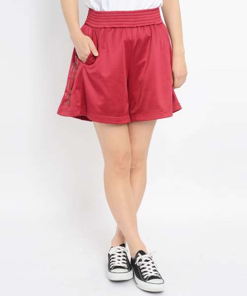 トレンド感の高いスポーツ系素材を使用したユニフォーム風デザインショーツは、本気になりすぎないようにフレアなシルエットにしてガーリー感をプラス★脇の切り替えにロゴプリント入り!