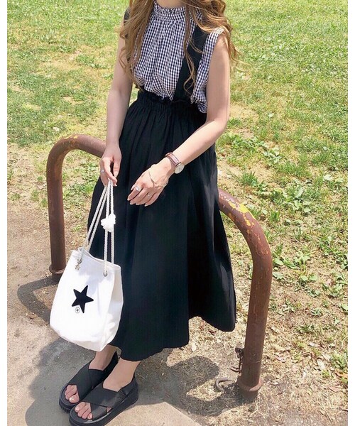 取り外しのできるサスペンダーがついたスカート。 ウエスト周りがすべてギャザーになっているのでかなり細見えします。 足首の出る丈感でどんなトップスにも合わせやすく作りました。 バッグのリボンで後ろ姿も可愛く、ポケットも付いているので機能性も◎です。 ※サスペンダーは3つ調整穴がついております。 ※バックのリボンはあくまでデザインなのであまり強く絞られますと ポケットの位置がズレてしまいますのでご注意ください。