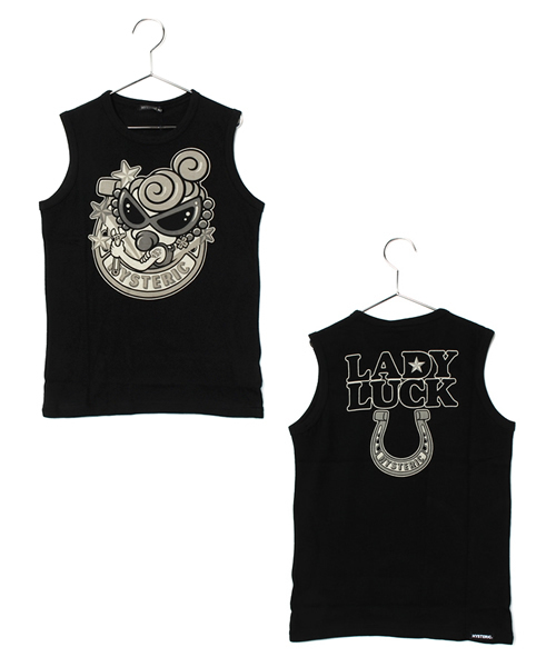 そもそも、LadyLuck (レディーラック)とは英語で「幸運の女神」の意味。LadyLuckの由来は第二次世界大戦の時、アメリカ兵達が、おまじないで四葉のクローバー、馬蹄などと一緒に「美しい女性」のTATTOOをすることから生まれましたの。今でも世界中で「幸運の女神」として愛されている・・・うん、何とも深い。深いよ、深い!って、感心してるのもさておき、このLadyLuckのモチーフをチョチョイのチョイと、アレンジを加えて出来たのが・・・ん~これい!!かわいく、ギャンブルの要素もいれつつ、TATTOO風に仕上りました。よくないこれ?よくよくよくよくよくないこれ?せい いやあー!!そんな事より、注目はこのノースリーブTシャツ!!プリントがかなり◎!!はい、このTシャツを着るキッズ諸君・・・幸運を祈る!!と言うか、運命は自分で変えられる!!オシャレに着こなしてくれい!! 店舗にてお問合せの際は、下記の品番をお申し付け下さい。品番:1442179