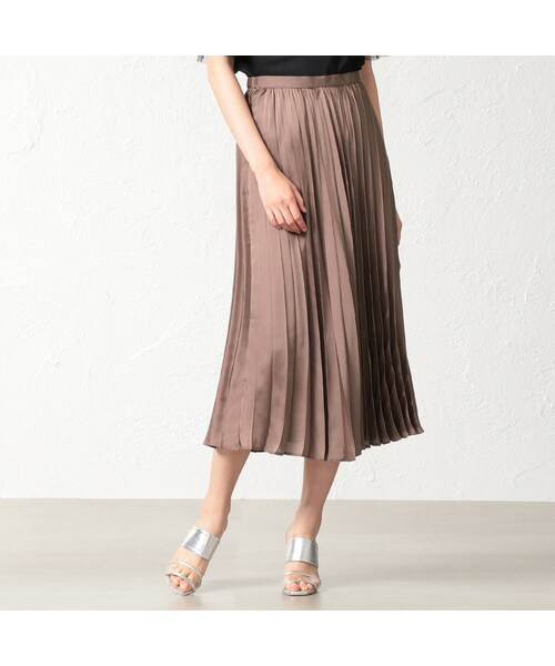 つややかな素材がエレガントな印象のプリーツスカート。 表地には軽やかなサテン地を使用しているので、歩くたびに揺れる裾が女性らしさを高めてくれる1着。 夏場はTシャツをインしたスタイルがオススメ。 レザージャケットやブルゾンなどとも相性が良いので、 秋口まで使える着用期間も長いアイテムです。