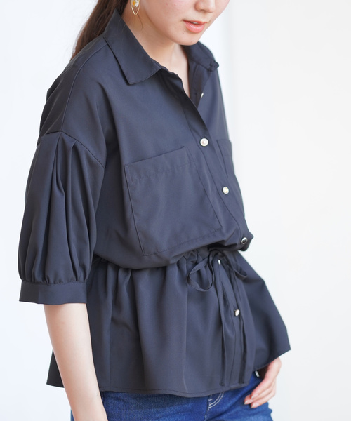 ボーイッシュなのに女性らしいブラウジングシャツブラウス両胸ポケットのサファリライクなシャツブラウス。コンパクトな衿が顔周りをすっきりとさせてフェミニンな雰囲気を作ります。アクセサリーのようなボタンはすべてデザインが違うところがポイント。ドロップショルダーとそこからふっくらと膨らむ袖が女性らしい手元を演出します。ウエストのリボンを絞ってペプラムブラウスとしても楽しめます♪裏地なし伸縮性なし薄手(1枚では透けます)前開きボタン留めウエストリボン入り(調節可)胸ポケットあり洗濯:手洗い可