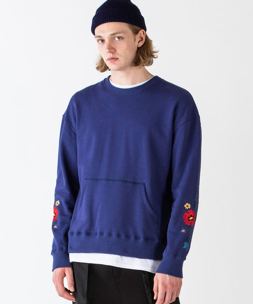 【 生地 】旧式の「アズマ」の編み機を使用し製作した裏毛を使用しています。しっかりとした厚みを持ちながらふくらみと柔らかさを持った生地です。【 デザイン・シルエット 】 袖にフォークロア調の花柄の刺繍が大胆に入ったクルーネックのスウェットカットソーです。大きめなカンガルーポケットも特徴的です。シルエットはドロップショルダー仕様でゆったりとした着こなしが可能でユニセックスで着用出来ます。