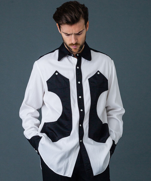 長時間に渡り、生地をもみほぐし、 ユーズドシャツのようなクタっとした風合いに仕上げたレーヨン/コットンの シャツ素材。ヨークのカッティングやポケットなどウエスタン調のデザインディテイールを 入れたシャツ。