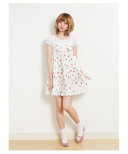 今のシーズンに大人気のチェリー柄を大胆に総プリントしたキャミソールワンピース。裾からはボリュームのコットンフリルを覗かせ、バストにはレースでライニングをして思いっきりドーリーにまとまった1着。バスト下のギャザーからたっぷり広がるシルエットもキュートポイント。※裏地あり【モデル身長:約168cm/着用サイズ:Fサイズ】