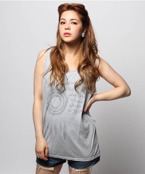 主張の強くないカスレっぽい薄めのロゴプリントが、ほんのりヴィンテージ感を演出する独特な風合いのノースリーブtops。 Uネックが鎖骨まわりをきれいに見せてくれ、カジュアルの中に女性らしさがあります。 ちょっぴりルーズなシルエットなので、ボトムインしたスタイルも◎ model H168 B85 W58 H88 着用サイズ:FREE