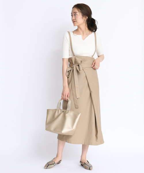 マルチに使えて1枚でこなれ感!!ウエストのリボンでサイズ調整ができ、幅広い方にお召しいただけるスカート。巻きスカート風に折り重なったデザインが◎ストラップが付いているので、ジャンバースカートのようにも使えて、1本だけ付けて、ワンショル風にも使っていただけます。また、ストラップなしでシンプルにお召しいただくのもおすすめです。カットソーやニット、ブラウスなどとも相性抜群です。