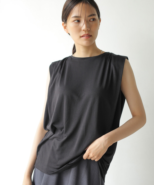 シンプルながらもタックでニュアンス感をプラスしたノースリーブプルオーバー。薄手でやわらかな素材を使用しているので夏も涼しい着用感です。ノースリーブでも肩幅が広めなので二の腕の露出を抑え、上品な着こなしが叶います。シンプルでさまざまなボトムと合わせやすく、大人女子におすすめの1枚です。