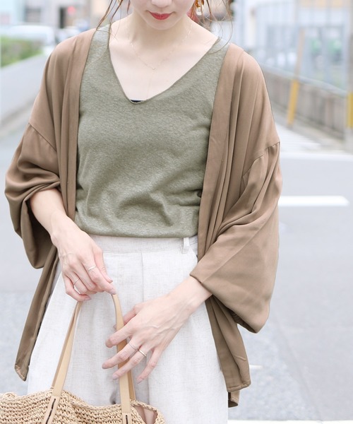 【ポイント】ゆるテロ素材で落ち感のあるこなれたシルエットを実現。さらっと羽織れる大人のとろみガウン。腰ひも付きでスタイルに合わせてスタイリングを楽しめます。☆スタッフおすすめポイント☆さっと羽織ったガウンスタイルや、腰ひもを結んでゆるっとライトアウターとしても着まわせる優秀アイテムです。【生地感】とろみのある生地感でしっとり優しい着心地。※生地の素材や種類によってシワになりやすいもの、または同じ素材でも製造時期によって異なる場合がございます。※モデル着用写真は撮影環境により、多少実際のカラーと異なる場合がございます。予めご了承をお願いいたします。※サイズは現物をスタッフが平置き採寸したものになります。※生産時期により若干の色ブレやサイズの変動が生じる場合がございます。予めご了承くださいますようお願いいたします。