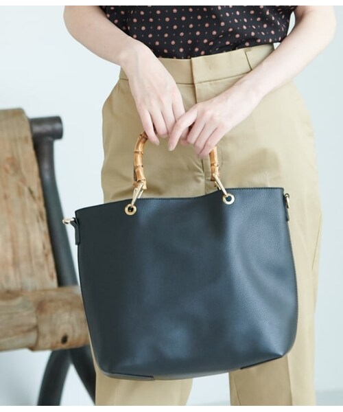 バンブーのハンドルがデザインポイントとなった、フェイクレザー1枚仕立てのトートバッグです。シンプルで使い勝手が良く、型押し素材のカラーポーチがセットになっているのもお得。ショルダーストラップ付きの2WAY仕様となり、装いに合わせた持ち方で取り入れられます。