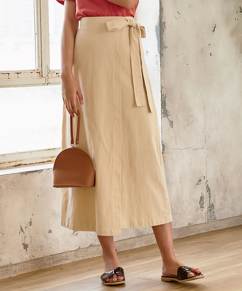 ウエスト部分にリボンが付いたラップ風マキシ丈スカート。タイトすぎない少し広がりのあるフレアシルエットが脚のラインを美しく魅せてくれます。これ一枚で今年らしい抜け感あるスタイルが完成します。シンプルなデザインなのでカジュアル~きれいめまで幅広く着まわせます。【素材・サイズ感】さらりとした表情のある綿100%素材で、夏だけでなくロングシーズン着られます。スカートの重なり部分は中で縫い付けているのではだける心配もありません。後ろウエストゴムとファスナー開きで着脱もらくらく◎裏地付きなのも嬉しいポイント。