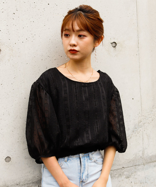 【VANNIE U シャーリングボリュームレースブラウス】 《styling》ふわっとしたボリューム袖がかわいい♡ 着丈が短めなのでロング丈のボトムス合わせてすらっと足長スタイリングするのがオススメ♪ 《detail》裾は幅広のシャーリングなので、ウエスト周りがすっきり見える仕上がりです! 袖は透け感のあるレースを使用しているのでふんわり軽い印象に♡