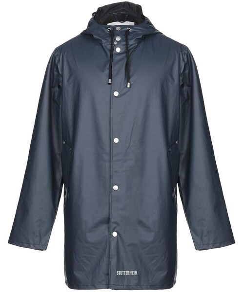 STUTTERHEIM Overcoats. techno fabric, logo, solid color, single-breasted, snap button fastening, hooded collar, multipockets, long sleeves, unlined. 50% Polyurethane, 50% Polyester