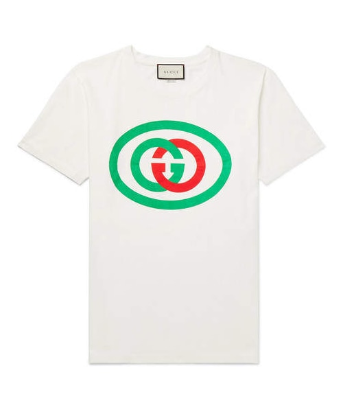 As printed on this T-shirt, Gucci 's interlocking 'GG' emblem is inspired by those found on '80s athleticwear. Cut from breathable cotton-jersey, it's stamped with the design in the house's signature green and red, and thoroughly washed for an almost vintage feel. Shown here with Gucci sweatpants, Gucci sneakers, Alexander McQueen cuff. - - Beige, green and red cotton-jersey - Crew neck - 100% cotton - Machine wash - Made in Italy