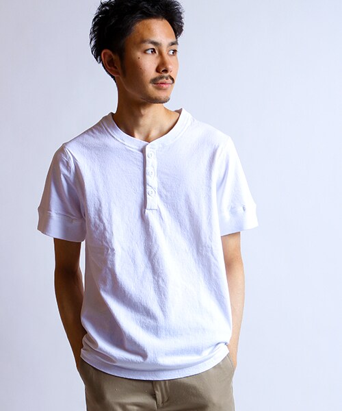 「古き良き時代のBASICなTEE SHIRTSをMADE IN USA で作りたい。」この言葉からこの企画は始まりました。古き良き時代のTEE SHIRTSを再現するだけでは面白味がない。私たちはTRADITIONAL AMERICAN BASICをいかに現代的にUPDATEするか?を念頭に置き、糸の選択からこの企画に取り組みました。使用した生地は7オンス。糸は18/-のオープンエンド糸。現代の市場にあふれているTEE SHIRTSのほとんどが30番や40番の単糸や双糸でできています。これらは確かにソフトでふんわりしていて着心地が良い。が、折角AMERICAで作るのであれば、やはり彼の地の味を最大限引出したいとの思いから、18/-を選択。18/-は日本ではあまりなじみのないヘビーウエイトの糸です。私たちは敢えて太く固い、且つ、オープンエンド糸を選択しました。オープンエンド糸は中に空気を多く含みますので吸湿性に優れ、速乾性も通常の綿糸よりも優れています。また非常にふっくらとした味のある表情になります。デメリットとしては繊維長が短いため、繊維が出やすく着たときにガサガサした固い着心地になってしまいます。これらのデメリットを払拭すべく、糸から生地にする際に加工後の縮みも考慮し、ソフトな着心地を目指すため、編立の調整も試作を重ねました。編立は昔ながらの丸編み機を使用し、TUBULAR(丸胴)仕様にしています。単糸を使用するとどうしても斜行してしまいますが、この斜行さえAMERICAの味ととらえ、斜行が気にならない丸胴を選択しています。デメリットの1つであった、繊維の飛び出しも加工のBALL BIO WASHで余分な繊維を飛ばし、ガサガサ感を軽減させ、SOFTな着心地を感じることができるようにしています。染めは顔料染を選択し、BALL BIO WASHすることにより、手に取ったその時から、ずっと着てきたような愛着の沸いた長年の相棒のような「味」を表現しました。ディティールはいたってBASICなHENRY NECKですが、上記のように緻密な計算をしながらも「MADE IN USAの味」を最大限に生かしたNEW BASICなTEE SHIRTSとして自信を持ってお勧めいたします。