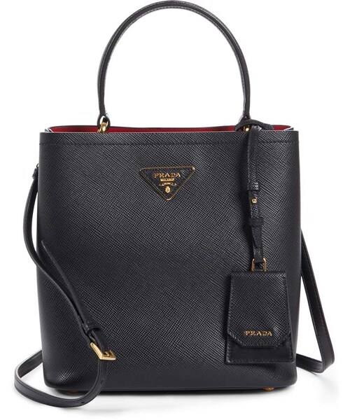 A bold color-pop lining brings a contemporary flourish to a structured bucket bag shaped from Saffiano leather and finished with gleaming logo hardware. An optional crossbody straps add hands-free convenience to the timeless look. Style Name:Prada Double Bucket Bag. Style Number: 5732803. Available in stores.