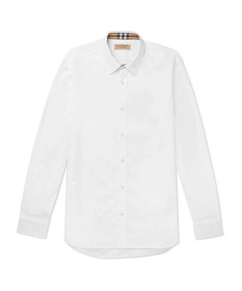 Take a look at the collar and cuffs of Burberry 's shirt and you'll see they're lined with the 'House Check'. Otherwise classic, this piece is cut for a regular fit from fine cotton-blend poplin and embroidered with a tonal logo for a neat finish. Shown here with SAINT LAURENT trousers, Prada shoes, Acne Studios pouch. - - White cotton-blend poplin - Classic collar, buttoned cuffs, embroidered designer emblem, checked collar and cuff lining - Button fastenings - 97% cotton, 3% elastane - Machine wash - Mother-of-pearl: French Polynesia - Imported
