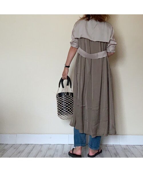 綺麗なドレープを出す為にサテン地を使用しているので、サラッとなめらかで肌触りが良いです。 動いた時のシルエットが軽やかで綺麗なのが特徴。 スタンドカラーできちんと見えも叶います◎ シャツガウンとしても前ボタンを閉めてワンピース風にも着ていただけます。 カラー:グレージュ×カーキ