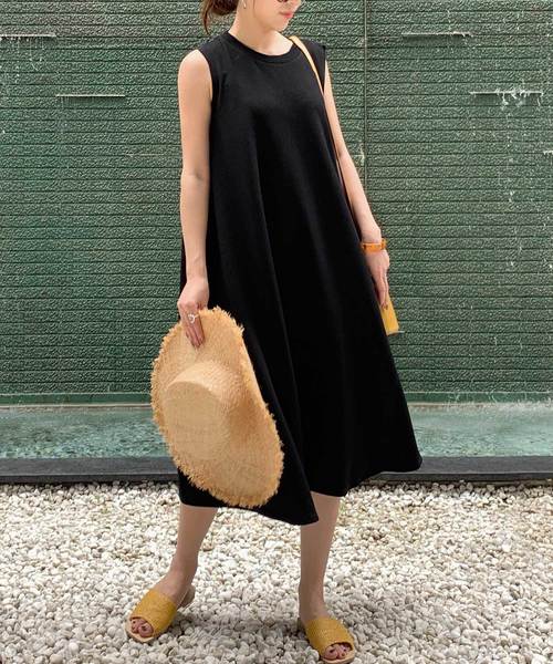 夏らしいカットフレアワンピースの登場。コンパクトなネックデザインが大人っぽく上品な印象を与えてくれます。1枚でさらりと着るのはもちろん、ワイドパンツなどボトムスのレイヤードも楽しめる優秀アイテムです。スリーブレスデザインなので、カーディガンやシャツなどサマーアウターとの相性も◎ 【素材・サイズ感】表面に凹凸のある肌に密着しにくい素材を使用。ストレッチ性があり、シルエットにもゆとりがあり涼し気でストレスフリーな着心地。デイリーにはもちろんリゾートシーンにもぴったり。膝下のロング丈で、気になるウエスト周りやヒップ、ふくらはぎもカバーしてくれます。