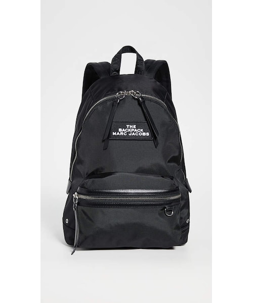 With a bold logo patch situated front and center, this Marc Jacobs backpack is a sleek version of a classic, utilitarian bag. Plus it's roomy enough to keep up with all your daily adventures and weekends away. Fabric: Technical weave Leather trim Logo patch Zip at top Zip front pocket Adjustable straps Lined Weight: 20oz / 0.57kg Imported, Vietnam Style # MJADB32980 Measurements Height: 14.5in / 37cm Length: 13in / 33cm Depth: 5.5in / 14cm