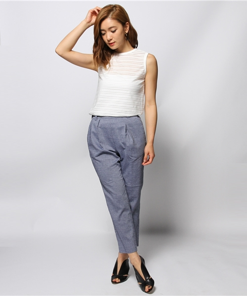 ●ノースリーブ コンビネゾン● カジュアルになりがちなコンビネゾンも透け感のあるトップで大人上品な雰囲気に。ウエストからの切り替えで1着で美スタイルに魅せてくれる万能アイテム。 model H160 B82 W58 H83 着用サイズ:ONE SIZE