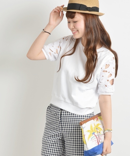 レーススリーブが清涼感たっぷりで可愛い、スウェットプルオーバー。大きなレースがガーリーな仕上がりに。ショート丈のデザインが、トレンドのミドルスカートやハイウエストアイテムとの相性もばっちり♪一枚でオシャレに決まるデザイントップスは暑い夏のマストアイテムです!! ※レースの出方が一点一点異なります。 ※末永く愛用頂く為に、アテンションタグを必ずご確認の上、着用又はお取り扱い下さい。 SHIPS各店へは下記品番にてお問合せください。 型番:322-32-0053 ※画像の商品はサンプルです。 実際の商品と仕様、加工、サイズが若干異なる場合がございます。 model:身長162cm 着用サイズ:ONE SIZE