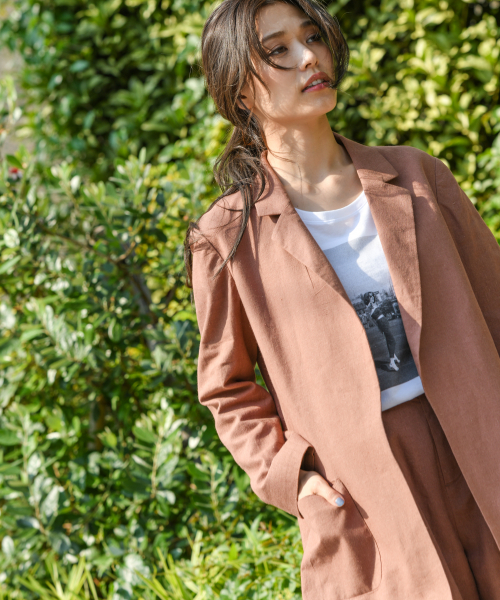 残暑の時期にぴったりの、秋色、綿麻素材のテーラードジャケット。赤みブラウンの無地と、素材の風合いが生きるナチュラル地のストライプ、2色をご用意しました。パッチポケットデザインであえてボタンを付けず、カジュアルな羽織りアイテムに仕上げました。Tシャツの上からさっと羽織るだけでコーデが一気に垢抜けます。夏⇒秋のスイッチアイテムにもおすすめ。同素材のパンツとセットアップの着こなしもおすすめです。※屋外の光や照明の当たり具合で、実際の商品の色味とカラー別画像の色味や風合いが異なって見える場合がございます。また雰囲気を重視した仕上がりとなっておりますので、商品の色味はスタジオ撮影の白背景の画像にてご確認ください。