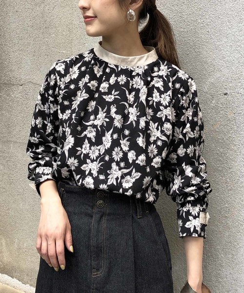 異素材MIXの大人な花柄ブラウス レトロな雰囲気のフラワープリントブラウスに ディテールをレザーで仕上げアクセントを付けました。 胸元にギャザーを入れ、立体感のあるシルエットに。 スタンドカラーで上品さもプラスしました。