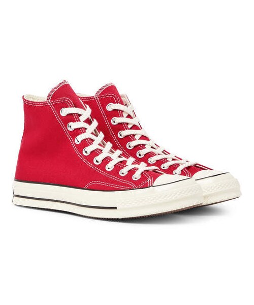 Modelled after Converse 's original 1970 heritage design, these red 'Chuck 70' sneakers have durable canvas uppers appliquéd with the signature leather star emblems at the sides. They're set on thick rubber soles that have an extra layer for insole and arch support. Shown here with Noon Goons trousers, Noon Goons jacket, Flagstuff T-shirt. - - Red canvas - Leather designer emblems, off-white rubber toecaps and soles - Lace-up - Designer colour: Enamel Red/ Black/ Egret - Imported