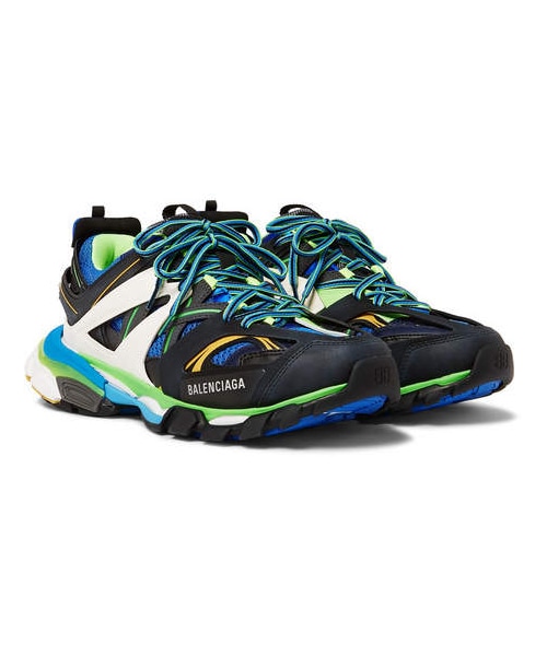 The layered uppers of Balenciaga 's 'Track' sneakers are an amalgamation both classic hiking and running styles – the label fused together 96 different technical components. They're made from leather, mesh and rubber and set on nine-piece rubber soles. Like the house's other kicks, they're embroidered with the European shoe size on the toes. Shown here with Balenciaga coat, Balenciaga T-shirt, Balenciaga jeans, Balenciaga bag. - - Black, green and white leather, blue mesh, black rubber - Pull tabs, padded collars, designer emblems, mesh linings, rubber soles - Lace-up - Come with dust bags and spare laces - Imported
